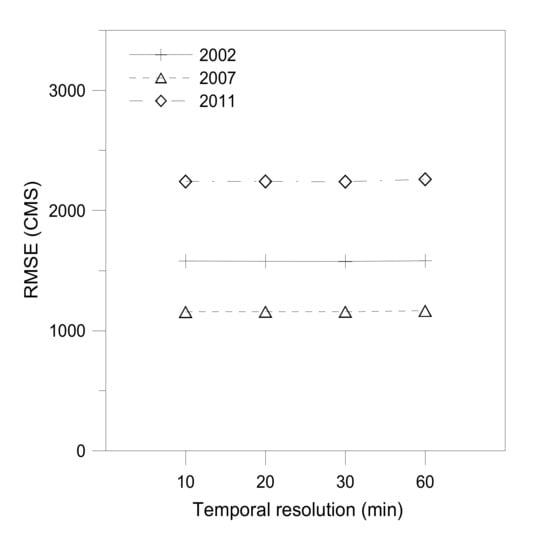 - The findings of the RMSE assessment for flood forecasting illustrated that variations in temporal resolution did not affect the RMSE significantly.