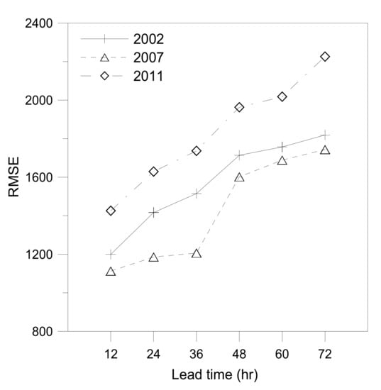 The discharge error measurement indicated that longer lead-times had lower accuracy as indicated by the increasing RMSE values. Accuracy assessments of lead-time variation demonstrated that lead-time dependency was almost negligible below the 36 h lead-time in the 2002, 2011 and 2007 events (Figure 13).