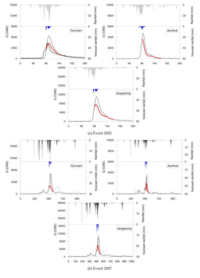 As previously described, a spatial resolution of 8 km, a temporal resolution of 60 min and a lead-time of 36 h were chosen for coupling the SURR and WRF models in the Imjin basin. Therefore, the time series analysis and the plots of forecast streamflow were created for the abovementioned spatial resolutions, temporal resolutions and lead-times. The accuracy of a streamflow forecast system is dependent upon how well the coupled models are able to make precise results. Consequently, to refuse or agree with the qualification of the model results is vital to establish accuracy measurements. The accuracy of a prediction is evaluated by comparing the observed, simulated and forecasted values. The simulation estimates conducted with the observation MAP and MAE are illustrated as the SURR model input; however, the forecast obtained with the ultra-fine scale, real-time meteorological data from the WRF model are used as the input to drive the SURR model. For the accuracy assessment of the coupled system, statistical error measures are used to describe the average deviations and compare the skill of hydrologic simulations and forecasts produced from the different inputs with observed streamflow. There are some efficiency criteria, such as NSE, MRE and REV, that are frequently used in hydrologic modeling assessments. The Jeonkok has no observation data for the 2002 event. The results of error measurements for the 2002, 2007 and 2011 events illustrated that the coupling system of the two models caused a decrease in the NSE and an increase in the error measurement indexes before and after linking the models (Table 11).
