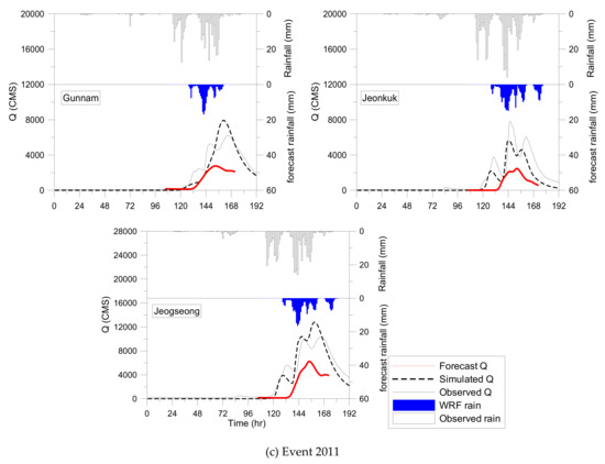 The performances of the SURR model in simulating the streamflow along with the SURR-WRF coupled model in forecasting the streamflow at the Gunnam, Jeonkok and Jeogseong stations in the 2002, 2007 and 2011 events are presented in Figure 14. The observed stream flow (black curve) is drawn to show the SURR model verification. The red curve indicates the forecast stream flow in the coupled SURR-WRF model, while the solid black curve shows the simulated streamflow using the observed meteorological data. The coupled SURR-WRF model is composed of the observed precipitation until the onset of the forecast time, and it continues using the WRF data to a 36 h forecast lead-time. The combinations of observed and real-time WRF data are used to drive the hydrological model. The observed and real-time forecast precipitations are shown separately in the upper and lower panels of Figure 14, respectively. This procedure is repeated for the next 6 hours to the end of the forecast time. Due to space limitation, briefly, one stream flow forecast is shown with relevant precipitation to indicate the real-time forecast discharge variation over time.