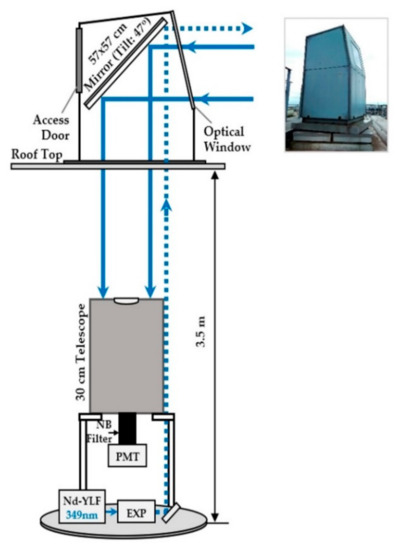 Figure 2 shows the schematic diagram of the lidar system, and Table 1 lists the lidar specifications. The light source is a diode-laser pumped Nd:YLF laser (Spectra-Physics, Santa Clara, CA, USA, Explorer 349) emitting at 349 nm wavelength with 60 ± 7 μJ pulse energy at 1 kHz pulse repetition rate. A photomultiplier tube (PMT, Hamamatsu Photonics, Japan, H10304-00-NN) is used as the receiver sensor in the aft-optics of a 30 cm diameter Cassegrain telescope. The PMT is connected to a transient recorder (Licel, Berlin, Germany, TR20-160) that records the backscattered signal with 5 min accumulation time at 7.5 m range resolution. The total extinction coefficient, , is derived using the Klett method [41] as