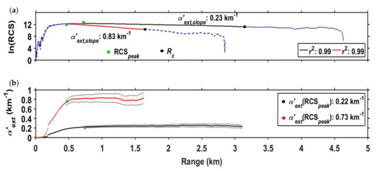 The range corresponding to RCSpeak varies between around 400 and 800 m, representing the balance between the lidar overlap function and the effect of the aerosol profile (i.e., backscattering and extinction) along the lidar path. The resulting value of Rc, on the other hand, changes between 1.3 to 5 km on non-rainy days, and this depending on the aerosol loading. Subsequently, we employ the adaptive slope method [38] to estimate the value of (Rc).