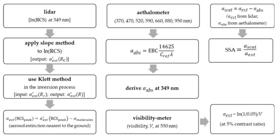 Figure 4 summarizes the flow of data in the present analysis. The near-surface aerosol optical properties ( and SSA) are derived from the data of three ground instruments, namely, the lidar, visibility-meter and aethalometer. The correlation between the from the lidar (349 nm) and the visibility-meter (550 nm) is examined, as presented below (Section 4.2). The value of SSA is calculated at 349 nm by using from the near-horizontal lidar; alternatively if from the visibility-meter were employed to calculate SSA at 550 nm, a limitation arises because of the lack of data for small aerosol loading (V ≥ 35 km). The ambient weather parameters including temperature (±0.3 °C nominal accuracy), RH (±2 percentage points), rain rate, wind speed (±1 m·s−1) and direction (±3°) are obtained every 5 min from the weather monitor (Davis Vantage Pro2).