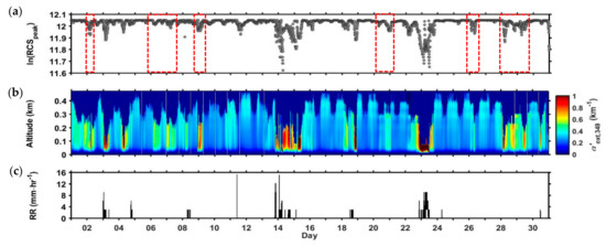 Temporal change of (a) lidar signal intensity represented by the RCSpeak in natural logarithm scale, (b) spatiotemporal variation of the lidar-derived total extinction coefficient, , at 349 nm, and (c) rain rate (RR) during the one-month observation period. The red broken lines in (a) indicate the days with high aerosol loading.