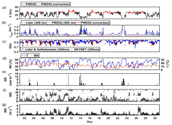 Temporal variations of aerosol and meteorological parameters observed for the whole campaign period in November 2017: (a) horizontal visibility (black) with extrapolated values (red) based on the regression line derived in Figure 6b, (b) aerosol extinction coefficient, αext, from both the near-horizontal lidar (349 nm) and visibility-meter (550 nm) data with the extrapolation for visibility ≥35 km, (c) single scattering albedo (SSA), from both lidar and aethalometer (349 nm), and sky radiometer of SKYNET (340 nm), (d) relative humidity (RH) and ambient temperature, (e) rain rate (RR), (f) wind direction (WD), and (g) wind speed (WS).