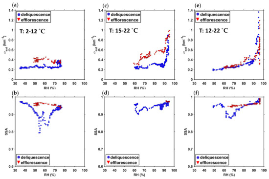 Hygroscopic aerosols (e.g., ammonium nitrate, ammonium sulfate and sodium chloride) exhibit hysteresis behavior during the increase and subsequent decrease of RH [69]. Figure 9 shows a 24-h diurnal variation of αext and SSA and their corresponding hysteresis (complete and incomplete) curves with RH measured during the deliquescence phase (from the midday minimum RH to late evening high RH), and the efflorescence phase (from the late evening high RH to midday minimum RH of the next day) for clear ((a) and (b), 21–22 November), cloudy ((c)–(d), 3–4 November) and rainy ((e)–(f), 2–3 November) conditions. Here, we discuss the influence of RH for a cycle of afternoon–night–morning, since the lack of insolation during the nighttime infers a more stable condition of the lower troposphere, as compared with daytime. For these days, the wind speed was less than 3 m·s−1 and the wind came predominantly from the N-NE direction (urban aerosols), with occasional occurrence of S-SW direction (maritime aerosol). From Figure 9c,e during the deliquescence phase (blue dots), the curve patterns of αext are comparable to the humidograph of a hygroscopic aerosol [69]. As RH increases (clear-sky: 35% < RH < 74%, cloudy: 60% < RH < 73% and rainy: 49% < RH < 71%), the value of αext is almost stable, and right after the deliquescence humidity (clear-sky: 74%, cloudy: 73% and rainy: 71%), the rapid increase in αext is apparent. The cases of the efflorescence phase (red triangles), on the other hand, are seen typically around early dawn to midday in a temperature range of about 2–22 °C. Although a complete hysteresis curve is observed under the cloudy condition, this is not the case for clear and rainy conditions. This can be ascribed to either the incomplete deliquescence–efflorescence cycle in a day to reach the efflorescence RH, or rapid increase in the BLH.