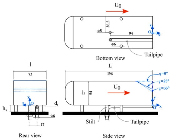If AR is below 6% [50], then no correction of the velocity measurements are expected due to the wall effects. According to the original shape proposed by Ahmed et al. [33], the dimensions of the models were defined as h = 0.054 m (height) and l = 0.073 m (width). The length of the vehicle was L = 0.196 m. With respect to the original model, the scale of the present models is 1:5.3 for an AR of 4.8%. Three car models were built with rear slant angles of 0° (squareback model), 25° and 35°. For each vehicle, four stilts were manufactured to fix the car on the bottom of the wind tunnel. Their height was hs = 15 mm, which is larger than the boundary layer thickness. Then, the dimensionless ground clearance was hg = hs/h = 0.28. Figure 1 presents three sketches (rear, side and bottom views) of the car models with all relevant notations.