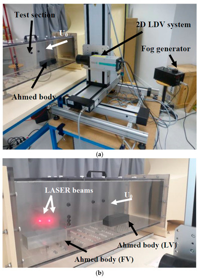 Velocity measurements were recorded with a 2D LDV system (DANTECMD Dynamics 2D Flow Explorer). Two pairs of LASER beams were emitted, one per velocity component (U is the horizontal component of the velocity and V the vertical one). Their wavelengths were 660 nm and 785 nm. The sizes of the measuring volume were 0.1684 × 0.1681 × 2.806 mm3 and 0.2003 × 0.1999 × 3.338 mm3, respectively. The numbers of fringes were 30 per pair of LASER beam. The interfringes were 5.448 mm and 6.396 µm. The focal length was lfl = 500 mm and the frequency shift for the Bragg cell was 80 MHz. The uncertainty for the measurement of the velocity was 0.07% [52,53]. This system was mounted on a 3D displacement table. The displacement spans over 410 mm in each direction with an accuracy of 0.01 mm. Figure 2a shows this experimental arrangement with the LDV system while Figure 2b is a zoom on the test section with the two car models (LV and FV).