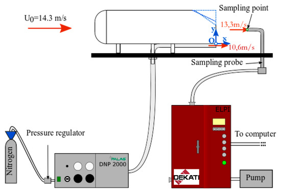 For the measurements of the Particle Number Concentration (PNC) in the wake of the car model, an ELPI (Electrical Low Pressure Impactor) was used. It allows concentration measurements for particles having a diameter between 30 nm and 10000 nm. For the detailed description of this device, one can refer to DEKATI [59] and Rodriguez [49]. Note that it was successfully used in previous work on the same topic [60]. A bended sampling probe was introduced into the test section. It sucked the air in the wake of the car model at a certain flow rate, which must correspond to an average velocity as close as possible to the inflow velocity. In the present case, considering the characteristics of the ELPI, this velocity was 13.3 m/s (difference was less than 7% compared to the inflow velocity U0). It was manually moved from one sampling point to another.
