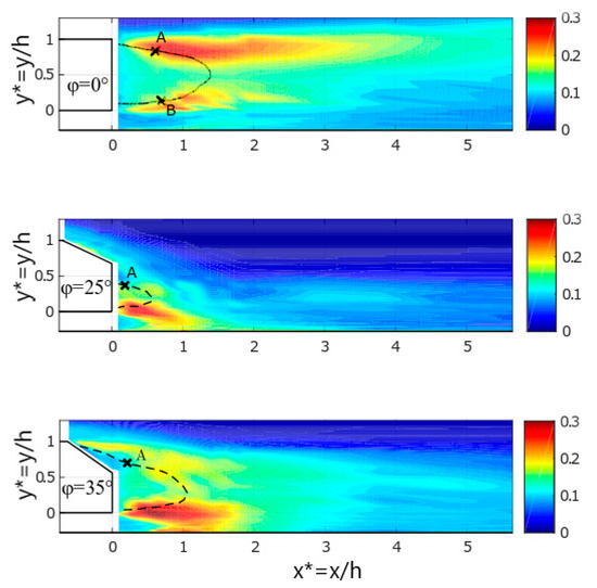 The difference between the three configurations is due to the flow attachment or detachment on the rear slant. For φ = 25°, the flow is attached. It induces a strong downwash effect limiting the volume of the recirculation region. For φ = 0°, the flow is fully detached and characterized by the longest recirculation length. For φ = 35°, an intermediate situation takes place. However, a flow detachment is observed leading to longer recirculation length compared to = 25°. These results were compared to the literature showing strong agreements. Indeed, Barros [62] found 1.45 < Lr/h < 1.52 while Grandemange et al. [40] gave Lr/h ~ 1.50 in agreement with Lahaye [63]. They worked with Reynolds numbers between 90,000 and 700,000. These coherent findings tend to validate the experimental setup. Furthermore, according to the literature [34,38,41,42,45,47,63,64], two counter rotating vortices develop in the close wake for the three configurations (the upper one being A and the lower one B). The corresponding positions of their centres (xA*; yA*) and (xB*; yB*) depend on and can be identified from streamlines. Table 2 present the comparison between the present results and those provided from the above-mentioned literature.