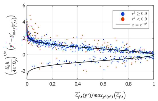 First, Dy was assessed from Equation (11). Since Dy is the sole unknown of the equation, it can be achieved from the data by identifying (the dimensionless position at which the peak of PNC is measured) and (the corresponding peak of PNC), for a given couple (x*, z*). Attention was focused on three vertical plans given by z* = −0.31; 0 and 0.31. Knowing and the corresponding PNC, Dy can be determined (Equation (13)):