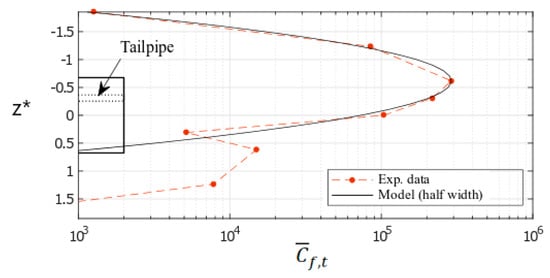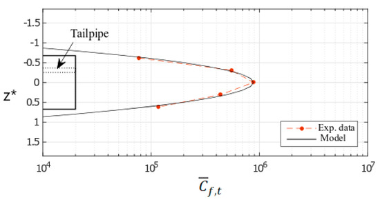 Taking that point into account, a first attempt was tried to improve the model. It considered the sole half-width of the vehicle containing the tailpipe. The updated model was applied at the same position as for Figure 7 showing that the correlation was significantly improved (Figure 8) on the tailpipe side. The diffusion coefficient in the z direction was re-evaluated to Dz = 0.0215 m2/s. In the previous model, Dz was overestimated (0.0253 m2/s), the difference being 18%.