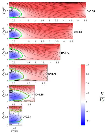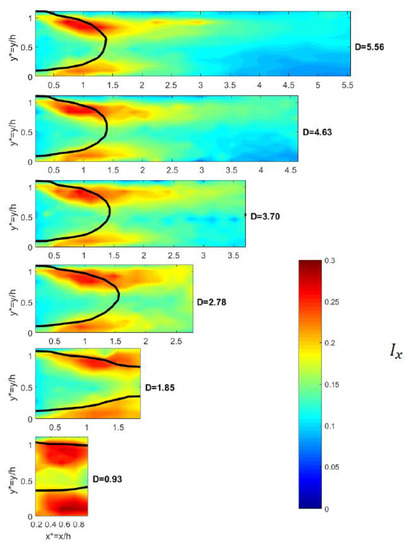 Turbulence intensity in the streamwise direction for z* = 0 for the six inter-vehicle distances D (φ = 0°). Black lines are isocontours U/U0 = 0.