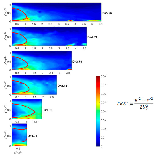 2D vertical map of the TKE* at the centreline of the wind tunnel (z* = 0) for the six inter-vehicle distances (φ = 35°).