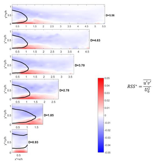 In order to deepen the characterization of the turbulent part, the maximum values of the dimensionless turbulent kinetic energy (TKE*) and their corresponding dimensionless positions are provided as a function of the dimensionless inter-vehicle distance for the three configurations (Table 9). A 2D vertical map of the TKE* at the centreline of the wind tunnel (z* = 0) is presented on Figure 11 for the six inter-vehicle distances for φ = 35°. On this figure, the red lines correspond to the isocontours U/U0 = 0. Similarly, the maximum and minimum values of the dimensionless Reynolds Shear Stresses (RSS*) in both upper and lower shear layers are given in Table 10 with their dimensionless positions. The reference values for a single vehicle (D→∞) are also indicated. Figure 12 present the 2D vertical map of RSS* field at the centreline of the wind tunnel (z* = 0) for the six inter-vehicle distances for φ = 35°. On this figure, the black lines correspond to the isocontours U/U0 = 0.