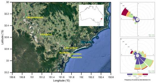 Four sampling sites were located in the Lower Hunter Region at Beresfield, Mayfield, Stockton, and Newcastle. The Lower Hunter Region is where the Hunter River valley opens out to a coastal plain along the NSW east coast. Major urban areas include the city of Newcastle and the Maitland regional centre. The Newcastle–Maitland urban area has a population of 430,000, with the highest population density of 2900 km−2 in the city of Newcastle [7]. The Port of Newcastle is the largest bulk shipping port on the east coast of Australia and an internationally significant coal export port.