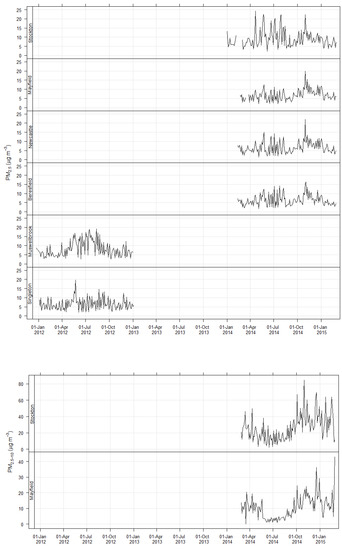 The time series of gravimetric mass measured on the filters at the six locations is shown in Figure 2. PM2.5 at Muswellbrook and Singleton in 2012 showed the highest concentrations between May and October 2012. Elevated concentrations of PM2.5 at Stockton, Mayfield, Newcastle, and Beresfield occurred between May and August 2014 and November and December 2014 when the peak concentrations occurred. A similar pattern was observed for PM2.5–10 at Stockton and Mayfield during 2014.
