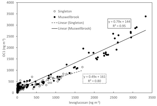 The woodsmoke factor was clearly identifiable as woodsmoke because it contained 85–90% of the levoglucosan and mannosan, both unique tracers for the combustion of cellulose found in trees and plants [25]. This factor also included about 20–30% of the organic carbon at all sites except Singleton, where it included 8% of organic carbon. The amount of black/elemental carbon sites varied from 20% at Muswellbrook, Beresfield, Stockton, and Mayfield to less than 5% at Singleton and Newcastle. Figure 3 shows a clear linear relationship between the volatile organic carbon fraction (OC1) measured by the IMPROVE-A method and levoglucosan, indicating that the woodsmoke was fresh, which is expected considering the proximity of the sampling sites to houses. Note that in the NSW 2008 emissions inventory, residential wood heater emissions were estimated to be 900 tonnes of PM2.5 and about 35 tonnes of PM2.5–10 in 2008 across regions of the Hunter, accounting for 94% of PM2.5 emissions from the residential sector during 2008.