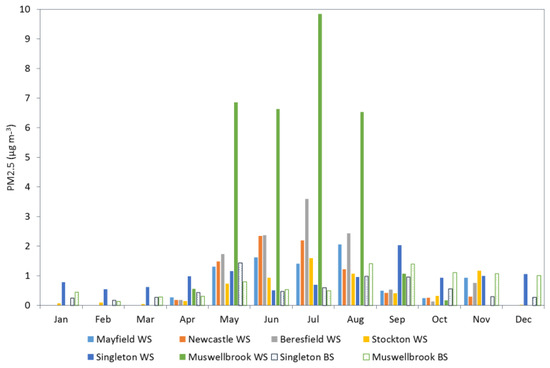 The highest average PM2.5 concentrations were measured at Stockton and Muswellbrook, and concentrations of PM2.5–10 were over two times greater at Stockton than at Mayfield. Stockton also measured the greatest maximum concentration in PM2.5 and PM2.5–10 concentrations. Average, minimum, and maximum PM2.5 concentrations were consistent across the other sites. The average concentrations shown in Table 2 were much lower than the National Environment Protection Measure (NEPM) for PM2.5 of 25 µg m−3 over 24 h, however the maximum concentrations approached this standard value at several of the sampling sites.