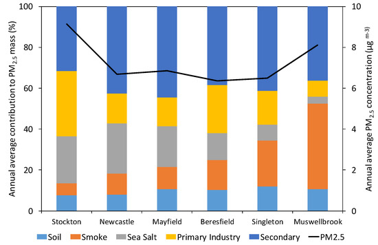 The largest contribution to PM2.5 was from secondary sources (32–44% or 2.1–3 µg m−3) at all sites except at Muswellbrook, where woodsmoke and industry sources each contributed about 40% (3.4 µg m−3). Except for Stockton and Muswellbrook, secondary reactions accounted for approximately 70% of the industry source, while at Stockton, with the presence of the prilling tower this split was 50% primary and 50% secondary while at Muswellbrook, the split was 20% primary and 80% secondary. Secondary industry contributions were lowest at Stockton and highest at Mayfield.