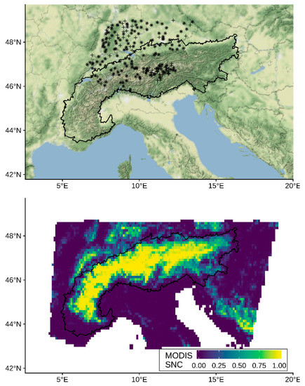 - Matiu, M.; Jacob, A.; Notarnicola, C. Daily MODIS snow cover maps for the European Alps from 2002 onwards at 250m horizontal resolution along with a nearly cloud-free version. Dataset Zenodo 2019. [Google Scholar] [CrossRef]