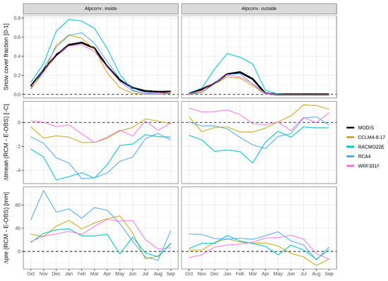 Comparison of reanalysis driven RCMs with observations (MODIS for snow cover, E-OBS for temperature and precipitation). Monthly averages are shown for inner (inside Alpconv) and outer (outside Alpconv) Alps for the period October 2002 to September 2008 for reanalysis driven RCMs (see Figure 1 for the Alpconv boundaries). Top panels show snow cover fraction over the year, middle panels show the difference between RCM and E-OBS mean temperature, and bottom panels show the difference between RCM and E-OBS precipitation.