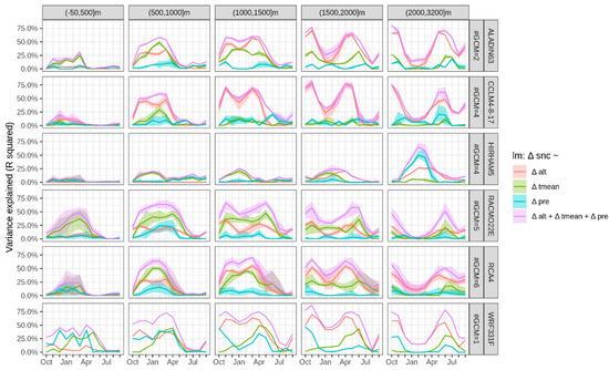 Linear regression models were applied to capture the contribution of altitude, temperature and precipitation differences on differences in snow cover. The model’s response variable was the snow cover bias and it was estimated using four sets of explanatory variables: (1) the altitude difference, (2) the temperature difference, (3) the precipitation difference, and (4) all these three differences. We computed the percentage of explained variance adjusted for the number of explanatory variables (i.e., the adjusted R squared) for each model, which then allows to judge the importance of each variable in isolation, and its share in the model that includes all three. The models were run separately for each month, each GCM-RCM combination, and for different altitude classes (<500, 500–1000, 1500–2000, and >2000 m).