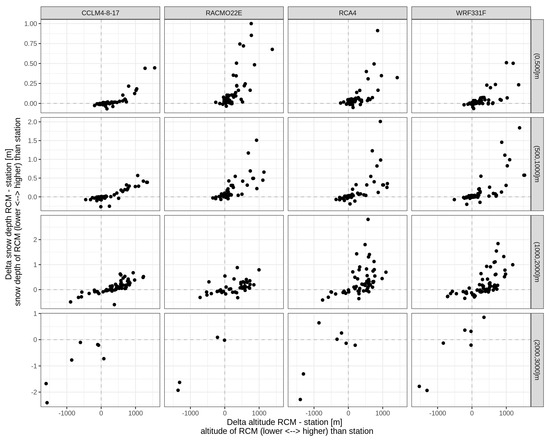 Figure 6 shows the relationship between difference in snow depth versus differences in altitude for January for reanalysis driven RCMs. As expected, there was again a clear relationship between biases in snow depth and orographic mismatch across all RCMs. Snow depth biases were lowest when altitude differences were lowest. This relationship was found for the other months as well and for GCM driven RCMs [22]. However, for the GCM driven runs, the RCMs had a positive bias (more snow) for altitudes >1000 m even when altitude differences were low, while for reanalysis driven RCMs, these biases centered around 0. This relationship was not present when looking at differences in temperature compared to differences in altitude [22]; only for the GCM driven runs, a minor correlation was observed.