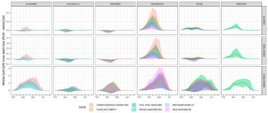 Average snow depth bias (RCM minus station) for stations that are within ±400 m of altitude difference with RCM orography. Lines indicate the median snow depth difference between the different RCMs and stations, and the transparent band is the IQR (inter–quartile–range). RCMs are shown in columns, with the driving GCM indicated in colors; rows are elevation classes of the stations. The number of stations is not balanced between elevation classes, and is ~55 for (0, 500], ~35 for (500, 1000], and ~9 for (1000, 2000].