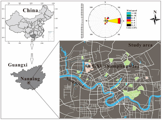 Nanning (107°45′ E to 108°51′ E, 22°13′ N to 23°32′ N) is the capital city of Guangxi Province. It is not only the political, economic, and cultural center of Guangxi province but also the largest city in Guangxi province. The air quality of Nanning has worsened because of rapid urbanization and industrialization [26]. In this study, we selected Guangxi University as the experimental site (108°17′ E, 22°50′ N), which is in the north of Nanning (Figure 1). The sampling site was located on the roof of the Comprehensive Experimental Building (an 11 stories high building, about 35 m above ground) on Guangxi University campus, which is the tallest building in Guangxi University; and there are no other taller buildings sheltering it. The sampling site is surrounded by roads with traffic, residential buildings, and business offices. The main street is 0.5 km away from the building. There were no obvious emission sources of atmospheric WSIIs in the vicinity of the sampling site during the study. The obtained PM2.5 samples represented the air at the sampling location, which avoided single point emission sources.