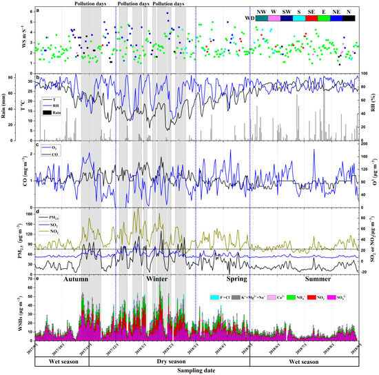Time series of weather records, gaseous pollutants concentration, particulate matter 2.5 (PM2.5), and ions concentrations. (a) Wind speed (WS) and wind direction (WD); (b) Temperature (T), relative humidity (RH), and rainfalls; (c) CO and O3 concentrations; (d) PM2.5, SO2, and NO2 concentrations; (e) water-soluble inorganic ion (WSII) concentrations.