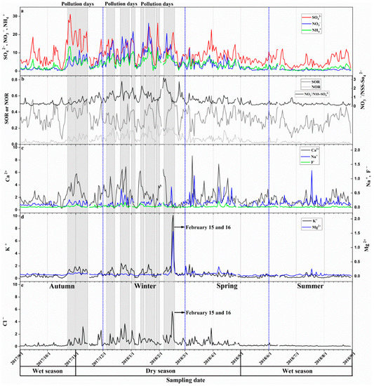 Time series of signal ions concentrations in sampling periods. (a) SO42−, NO3−, and NH4+ concentrations; (b) SOR, NOR, and NO3−/NSS-SO42−; (c) Ca2+, Na+, and F− concentrations; (d) K+ and Mg2+ concentrations; (e) Cl− concentrations. The unit of ions is μg·m−3.