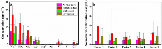 Five factors were identified and quantified based on the PMF model (Table 1). It could be seen that factor 1 contributed 79.1% to NO3− and 38.5% to NH4+, factor 2 contributed 59.3% to K+ and 55.2% to Mg2+, factor 3 contributed 68.5% to SO42− and 55.4% to NH4+, factor 4 contributed 86.0% to F−, 77.7% to Ca2+ and 45.9% to Na+, and factor 5 contributed 62.3% to Cl−. Their percent contributions to PM2.5 were 20.8%, 10.5%, 41.8%, 17.7%, and 9.2%, respectively. The variations of contributions from different factors in the different seasons were consistent with WSIIs concentrations (Figure 4), which suggested that normalized contributions were higher in the dry season and pollution days than that in the wet season and normal days.