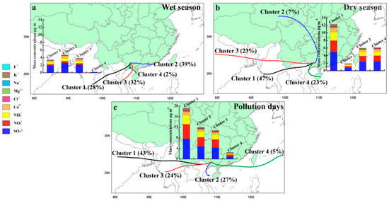 All the trajectories in different seasons can be classified into four main categories (clusters) based on their origins, paths, and latitudes (Figure 5). In these four main clusters, the high frequencies of clusters were from east, west, and southwest, and the higher frequencies of clusters corresponded with the higher mass concentrations of WSIIs (Figure 5). To be specific, in the wet season, the main trajectories with high mass concentrations of WSIIs were the short east airflow from eastern Guangdong province and the long southwest air parcel from Vietnam and Myanmar. In the dry season, the main clusters with high mass concentrations of WSIIs were western long transport paths from the north of India and west of Myanmar, and southwest short transport paths from east of Hainan province. On pollution days, the main four clusters were similar to those in the cold months, showing that high frequencies and high mass concentrations of WSIIs in the cluster were the west and southwest transport patterns from India, Myanmar, and the Northern Gulf near Guangxi province.