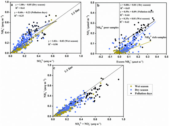Results suggested that NH4+ had a strong linear correlation with SO42−, and the slopes were closed to 1 in the wet season and dry season. On pollution days, the linear correlation between NH4+ and SO42− were weak (R2 = 0.25), and the slope of the linear equation was <1 (Figure 6a). Excess NH4+ (excess [NH4+] = ([NH4+]/[SO42−] − 1.5) × [SO42−]) and NO3− concentrations were used to show characteristics of nitrate formed via the homogenous gas-phase reaction between ammonia and nitric in this study [43] (Figure 6b). The NO3− was positively and linearly correlated with excess NH4+ when excess NH4+ >0 (Figure 6b). There was also a strong positive linear correlation between [SO42− + NO3−] and [NH4+] and the slope was <1.