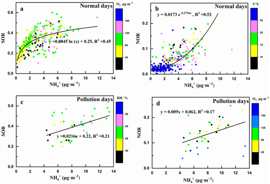 Scatter plots of SOR and NOR versus NH4+ on normal days and pollution days. (a) SOR versus NH4+ on normal days, the color scale represents O3; (b) NOR versus NH4+ on normal days, the color scale represents Temperature; (c) SOR versus NH4+ on pollution days, the color scale represents RH; (d) NOR versus NH4+ on pollution days +, the color scale represents O3.