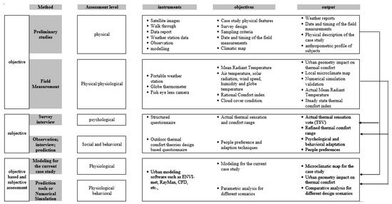 All four phases can then interrelated and compiled systematically within a comprehensive framework. In this way, the framework overcomes common study limitations, but also, and more importantly, permits the identification of overall human outdoor thermal comfort by proposing guidelines to improve microclimate and outdoor thermal comfort based on an examined case study (Figure 1).