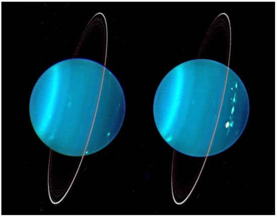 - Sromovsky, L.; Fry, P.; Hammel, H.; Ahue, W.; de Pater, I.; Rages, K.; Showalter, M.; van Dam, M. Uranus at equinox: Cloud morphology and dynamics. Icarus 2009, 203, 265–286. [Google Scholar] [CrossRef][Green Version]