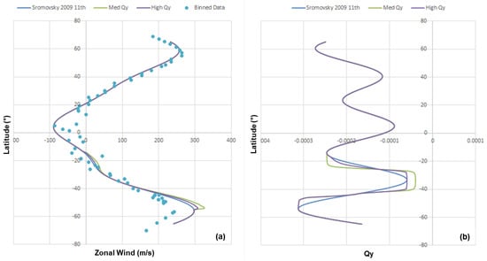 Uranian zonal wind profiles used in this study, with: (a) Zonal wind profiles including 11th-order Legendre polynomial from [] and observed cloud-tracking data binned at 1 intervals from []. (b) Derivative of the absolute vorticity with latitude, , for the three profiles.