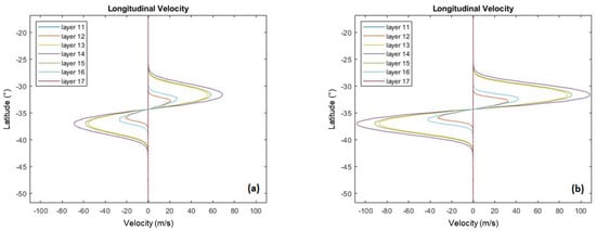 Currently, the physical origin of the vortices on the ice giants is not known. Therefore, for these studies, they were induced in the model by introducing vortex-like winds on top of the zonal wind background along with altering the background Montgomery potential in a consistent fashion for an ellipsoidal vortex. However, the quasi-geostrophic balance assumed to generate these vortices is approximate, so the resulting features generally undergo a several simulated day period of adjustment before achieving a more stable state. For this study, a gaussian ellipsoid like that used in [] for the UDS was employed. In this case, the ellipsoid was defined by an estimated strength of the maximum winds and the major and minor axes of the vortex. This study assumed two spot sizes, 8 × 4, comparable to that used in the UDS study, and a larger version 16 × 8. The vertical gaussian decay scale is 0.5 bar both upward and downward with a central pressure of 1 bar, resulting in an initial spot extending between layer 12 to layer 16 as can be seen in the distribution of relative longitudinal velocities along the minor axis which decay in magnitude moving away from the central layer 14 (Figure 3). Initially, two velocity strengths of 70 m/s and 110 m/s were used, the values corresponding to roughly the maximum relative velocities in the generated vortices in this central layer. Thus, the initial study consisted of 12 simulations (three zonal wind profiles, two spot sizes, and two strengths) with the initial vortex centered at −34 and 1 bar in pressure. Subsequent simulations were conducted based on these initial results, including simulations at different vortex strengths and initial latitudes.