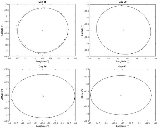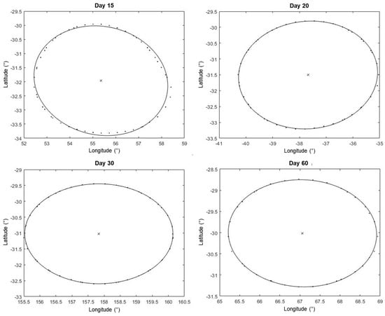 Elliptical vortex fits of closed potential vorticity contours at 700 hPa for Simulation 3. Points are the data from the potential vorticity contour, the line is the elliptical fit.