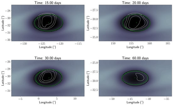 Dark spot defined by methane optical depth for Simulation 21. Elliptical vortex fits of closed potential vorticity contours at 500 hPa in green, of methane optical depth in black. The dashed white contours represent the cloud feature in terms of methane ice column density.