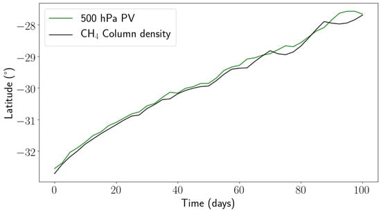 The vortex evolution for Simulations 3 and 7 at a pressure of 700 hPa are provided in Figure 4 and Figure 5. The vortex was defined by an elliptical least-squared fit of points taken from a closed-loop potential vorticity contour. This ellipse was used to define the center of the vortex, in turn defining the latitude of the vortex and thereby the drift rate.