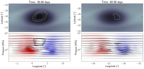 Figure 8 shows sample vertical-longitudinal velocity fields cut along the central latitude of the vortex and the vertical cloud extent in this plane in conjunction with a latitude-longitude view of the vortex and cloud feature. The cloud is located between the regions of upwelling and downwelling and above the main vortex centered at 1 bar. Figure 9 shows the horizontal velocity field (arrows) and vertical velocity field (colored contours) at 0.5 and 1 bar at day 30. The upwelling and downwelling regions predominantly have a simple east-west dipole pattern, although the exact location shifts with altitude.