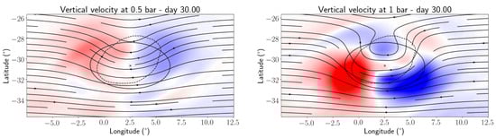Wind field at 0.5 and 1 bar at day 30 for Simulation 21 with the horizontal field shown by streamlines and the vertical field represented by color, with red corresponding to upward velocities and blue downward with maximum color magnitude corresponding to 10 cm/s.