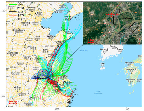 The Yangtze River Delta (YRD), with Shanghai as its center and 26 cities in Jiangsu, Zhejiang, and Anhui province, is one of the most economically developed and densely populated regions in China. Several haze-fog episodes with sulfate, nitrate, ammonium, and organic aerosol as major components have been observed in the YRD [21,22,23,24]. High pressure system, subsidence airflow, and calm surface wind are responsible for the decrease of the planetary boundary layer (PBL) and the accumulation of pollutants [25]. The high extinction coefficient in the YRD is attributed to the aerosol mass concentration and is affected by the aerosol chemical component, PNSD, and water vapor [26]. Higher accumulation mode particle counts, and higher RH were the main reasons for the decrease of atmospheric visibility [27,28,29]. The transformation of SO2 and NO2, which primarily originated from fossil fuel combustion and vehicle emissions, contributed a substantial amount to the high concentration of secondary nitrate and sulfate in the YRD [30,31,32].