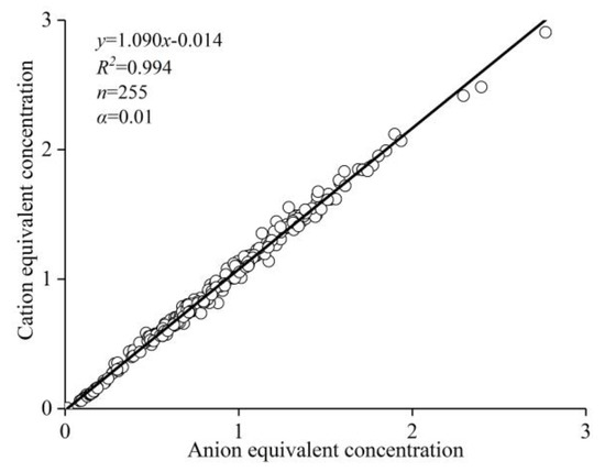 The correlation between anion equivalent concentration and cation equivalent concentration.