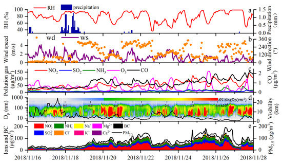 Figure 3 shows that the RH exhibits a significant daily variation. It was low in daytime and high in nighttime during the observation, with an average value of 78.7 ± 15.4%, which was conducive to the mutual transformation of different processes in a haze-fog episode. The wind direction was primarily north and east, and the maximum wind speed was 4.2 m·s−1 and the average wind speed was 1.2 ± 0.8 m·s−1. The lower wind speed is related to the static and stable weather caused by the high pressure control on the ground during the observation, which is not conducive to the diffusion of pollutants [25]. The average visibility during the observation was 4.8 ± 4.5 km, and the maximum visibility exceeded 10 km for only three days (November 16, 17, and 23). In the first three days of observation, the clean process was primarily affected by precipitation and mist appeared at night. Affected by solar radiation, the concentration of O3 presents distinct diurnal variation characteristics, while other pollution gases were relatively stable. PNSD was distinctly affected by the wet removal of precipitation. Visibility initially increased and then decreased to attain a maximum of 24.9 km at 13:00 on 17 November, 2018. The average concentration of PM2.5 was 24.2 μg·m−3 on the first three days.