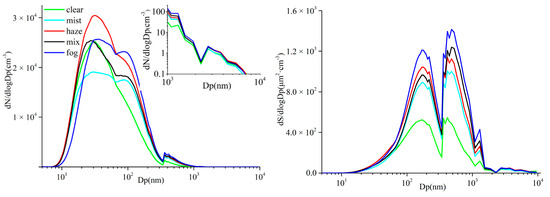 Figure 5 shows that the PNSD was unimodal in the clean, haze, and mix processes, and bimodal in the mist and fog processes. The mist process achieved the smallest peak values of 19,101 cm−3 and 17,506 cm−3, and the peak particle diameters were 30 nm and 87 nm, respectively. The peaks of the fog process were 25,660 cm−3 and 23,186 cm−3, and the particle diameters at peak were 36 nm and 87 nm, respectively. The peak value of the clean and mix processes was similar to that of the fog process, which was 1.32 times and 1.33 times, respectively, that of the mist process, and the peak particle diameters were 32 nm and 27 nm, respectively. The maximum peak value of the haze process was 1.59 times the mist process, and the diameter at peak was 32 nm. The main mode of the aerosol number concentration in different processes was Aitken mode (10–100 nm). The proportion of the particle number concentration in Aitken mode was 85.1%, 75.8%, 79.1%, 77.5%, and 73.5% in the processes of clean, mist, haze, mix, and fog, respectively. The dominant particle size of the clean process, mist process, haze process, mix process, and the fog process was 20–40 nm, 20–50 nm, 25–40 nm, 20–40 nm, and 25–55 nm, respectively.
