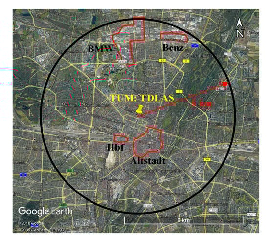 - Zhao, X.; Marshall, J.; Hachinger, S.; Gerbig, C.; Frey, M.; Hase, F.; Chen, J. Analysis of total column CO2 and CH4 measurements in Berlin with WRF-GHG. Atmos. Chem. Phys. 2019, 19, 11279–11302. [Google Scholar] [CrossRef]